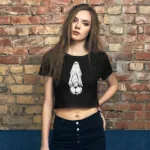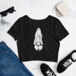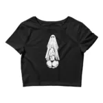 Image of a trendy Ghostly Booty Graphic Crop Tee, showcasing a playful white ghost design on the front, made from a comfortable cotton-polyester blend, perfect for adding a whimsical touch to any outfit.